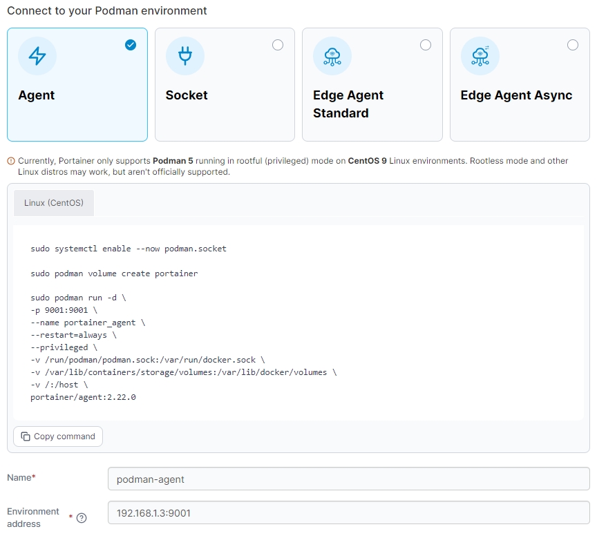 Next, select Podman as the environment type then click Start Wizard. Select the Agent option, then your environment type. Copy the commands and run them on your Podman instance.