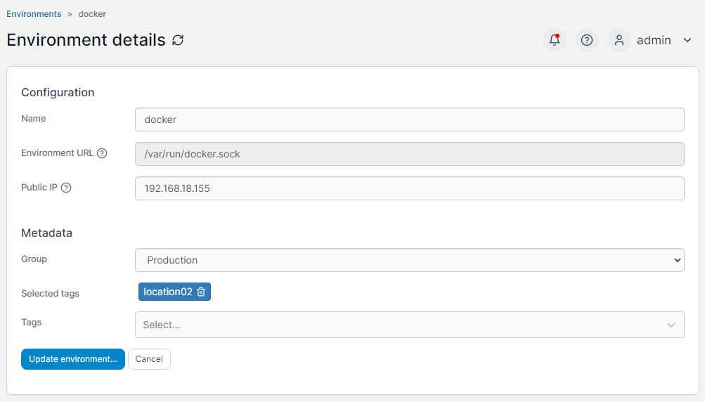 The URL or address of the environment that is used by Portainer to connect and manage the environment. This could be a Docker socket or API, or the address and port of a Portainer Agent. Edge Agent environments will not have this field.