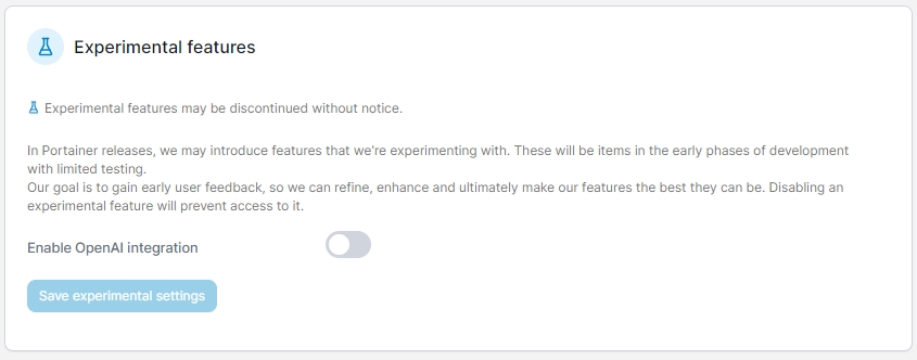This section allows you to enable experimental Portainer features for use in your deployment. These features are in early development and have gone through a limited set of testing, and are provided to users in order to gather feedback on the feature at an earlier stage of development.