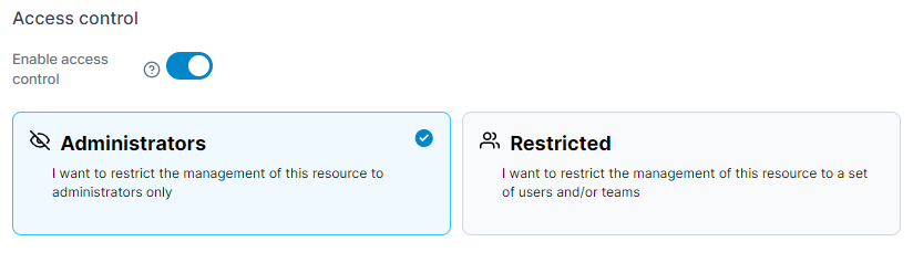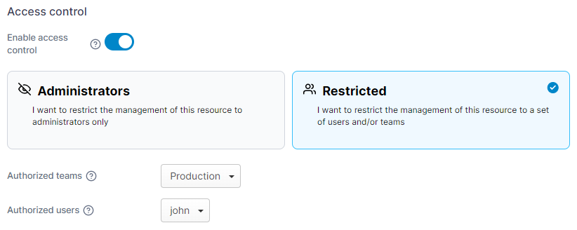 This is an example access control section showing access control enabled in Restricted mode. After you select the Restricted option, you can select more teams and users and give them access to the resource.