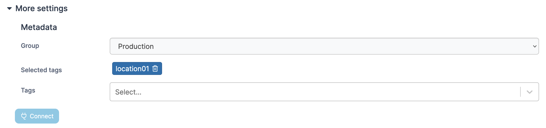 As an optional step you can expand the **More settings** section and categorize the environment by adding it to a [group](https://docs.portainer.io/2.33-lts/admin/environments/groups) or [tagging](https://docs.portainer.io/2.33-lts/admin/environments/tags) it for better searchability.