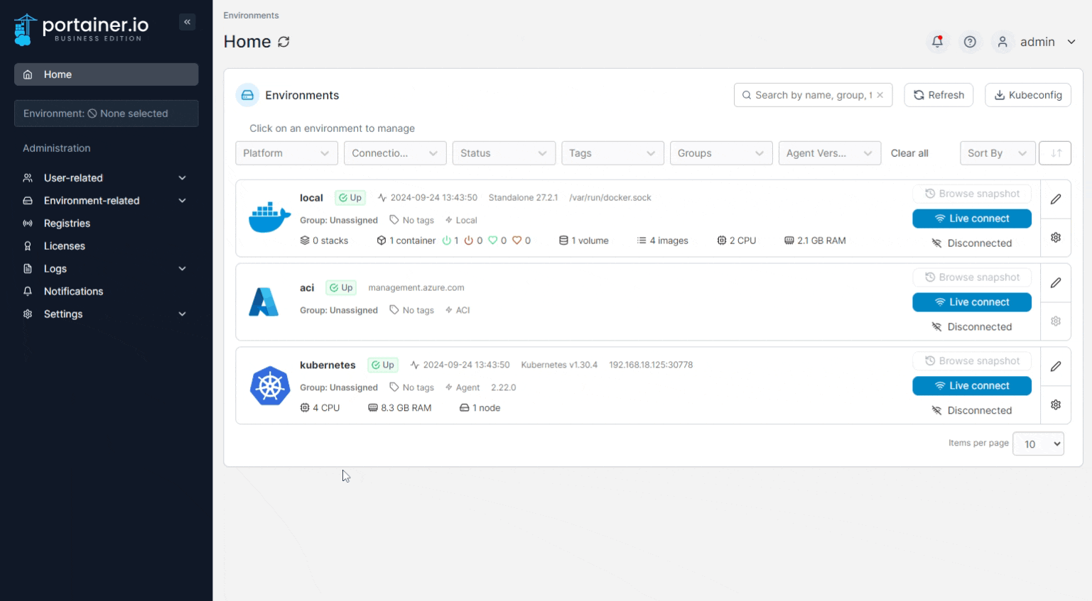 When you're ready, click **Connect**. If you have other environments to configure click **Next** to proceed, otherwise click **Close** to return to the list of environments.