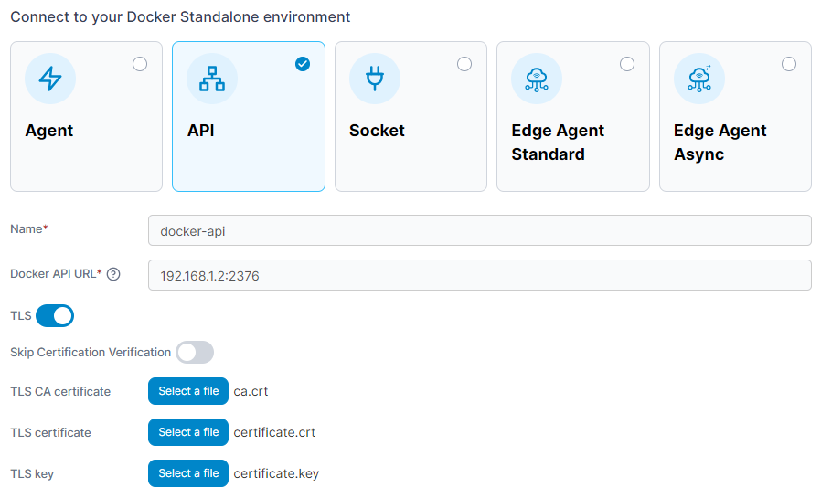 <table><thead><tr><th width="280">Field/Option</th><th>Overview</th></tr></thead><tbody><tr><td>Name</td><td>Give the environment a descriptive name.</td></tr><tr><td>Docker API URL</td><td>Enter the DNS name or IP address to connect to the Docker host along with the port. When connecting without TLS, the default port is <code>2375</code>. When connecting with TLS, the default port is <code>2376</code>.</td></tr><tr><td>TLS</td><td>Toggle this option on if you wish to use TLS. Toggle it off if you don't want to use TLS.</td></tr><tr><td>Skip Certification Verification</td><td>Toggle this option on to skip the verification of the TLS certificate used by the Docker API. If this option is off, the below fields will not appear.</td></tr><tr><td>TLS CA certificate</td><td>Select your CA certificate.</td></tr><tr><td>TLS certificate</td><td>Select your certificate.</td></tr><tr><td>TLS key</td><td>Select the key that matches the certificate.</td></tr></tbody></table>