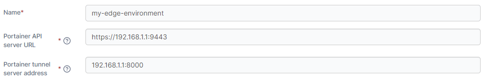 | Portainer API server URL        | Enter the URL and port of your Portainer Server instance as it will be seen from your Edge environment. If using a FQDN, ensure that DNS is properly configured to provide this.                                                                                                                                                                                                                                                                                                                                                              |
