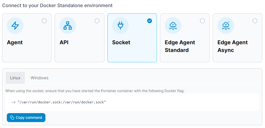 Next, select **Docker Standalone** as the environment type then click **Start Wizard**. Select the **Socket** option and your platform. You will be shown the required parameter to pass to the Portainer container as part of your `docker run` command.