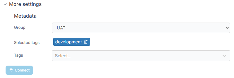 As an optional step you can expand the **More settings** section to categorize the environment by adding it to a [group](https://docs.portainer.io/2.33-lts/admin/environments/groups) or [tagging](https://docs.portainer.io/2.33-lts/admin/environments/tags) it for better searchability.