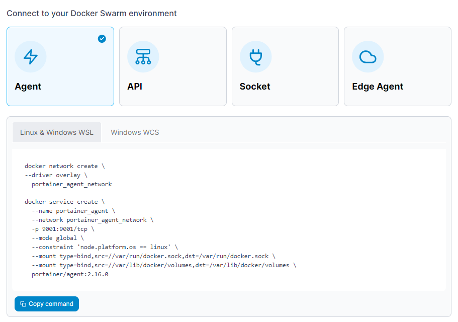 Next, select **Docker Swarm** as the environment type then click **Start Wizard**. Select the **Agent** option and your platform. Copy the command, then run it on the manager node of your Docker Swarm cluster. For example, if you are deploying on a Linux machine or a Windows machine with WSL installed, use the **Linux & Windows WSL** command. If you are deploying on a Windows machine with WCS, use the **Windows WCS** command.