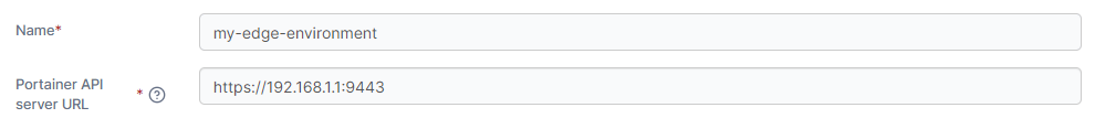 | Portainer API server URL | Enter the URL and port of your Portainer Server instance as it will be seen from your Edge environment. If using a FQDN, ensure that DNS is properly configured to provide this. |