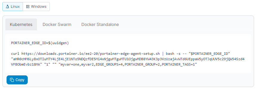 This section allows you to create customized scripts to quickly onboard a number of Edge Agents automatically. Your selections will update the script provided at the bottom of the page which you can then run on your remote environments.