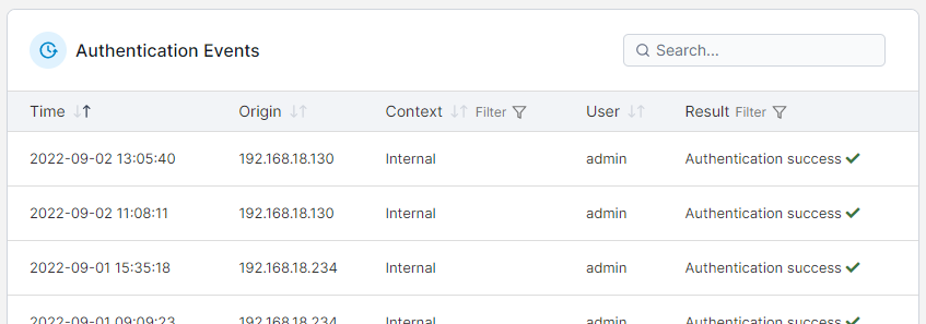 Authentication events are searchable and filterable, and the date and time, origin IP address, context, user and result are provided for each.