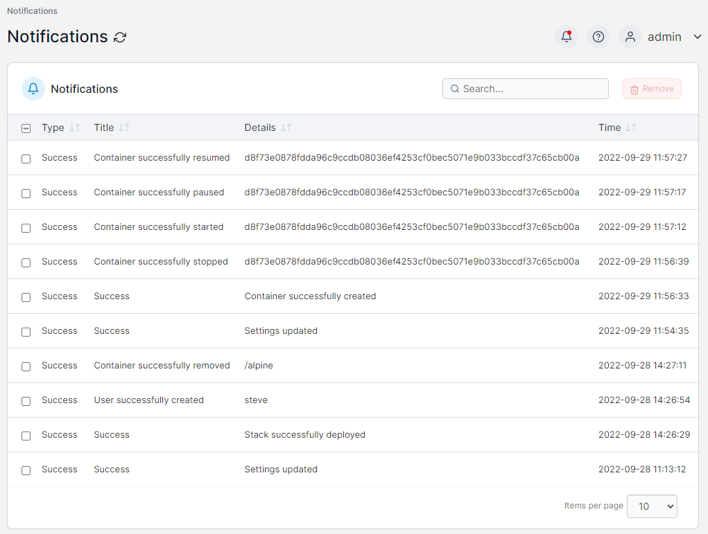 The Notifications section contains a record of all the notification messages you have received in Portainer (the popup messages that appear in the top right of the interface). You can search through past notifications as well as remove specific notification records from the list.