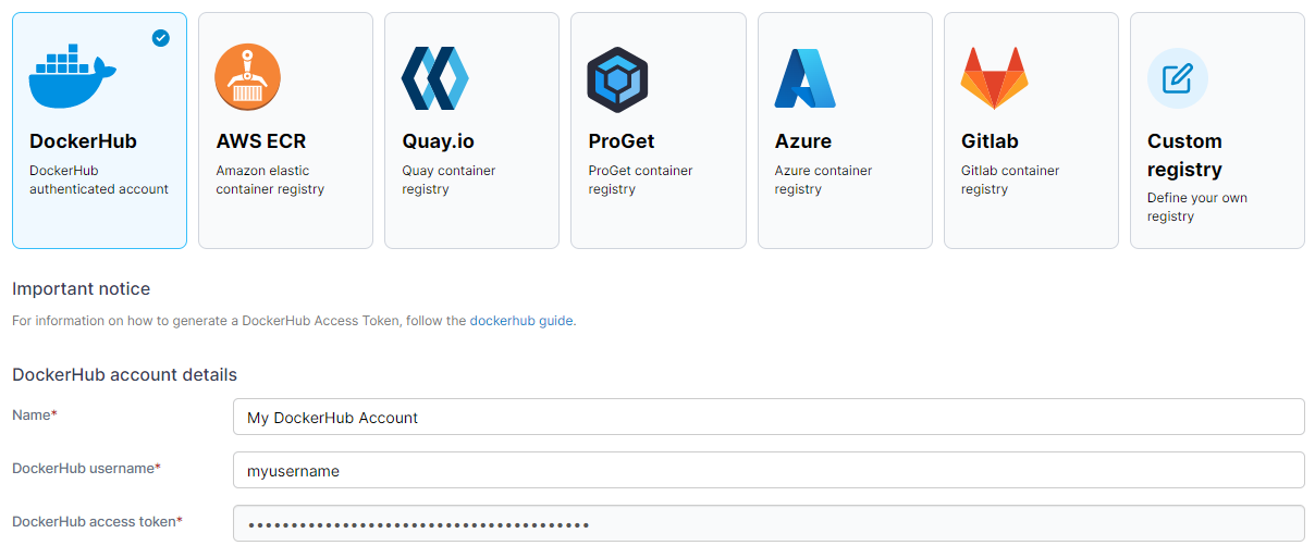 Enter a Docker Hub personal access token that corresponds to the username above. You can create an access token by logging into Docker Hub, clicking your username in the top right and going to Account Settings then the Security tab.
