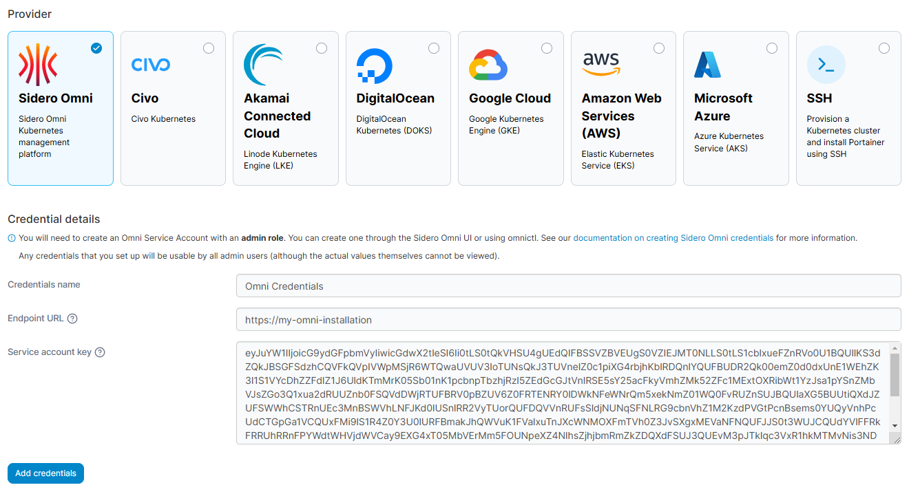 To add credentials for an Omni account, from the [Shared credentials](https://docs.portainer.io/2.33-lts/admin/settings/credentials) page click **Add credentials**, then select the **Sidero Omni** option. Give your credential set a **name** and paste your **Endpoint URL** and **Service account key** into the respective boxes.