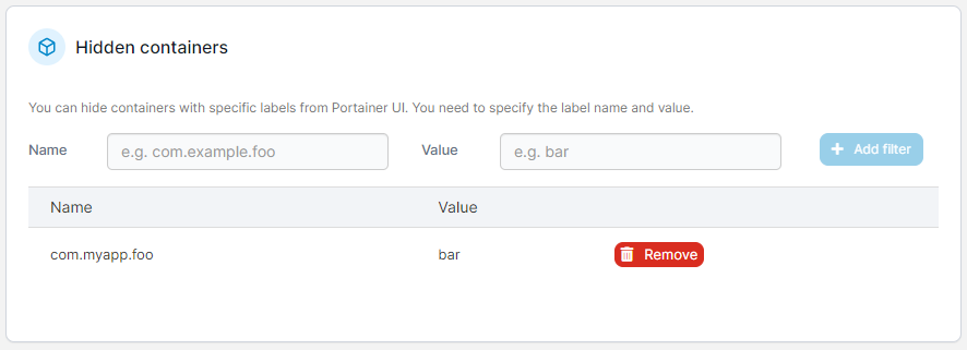 Stops a container from appearing in the Portainer UI through the container label. Enter the name and value of the label, then click **Add filter**. Containers with matching labels will be hidden.