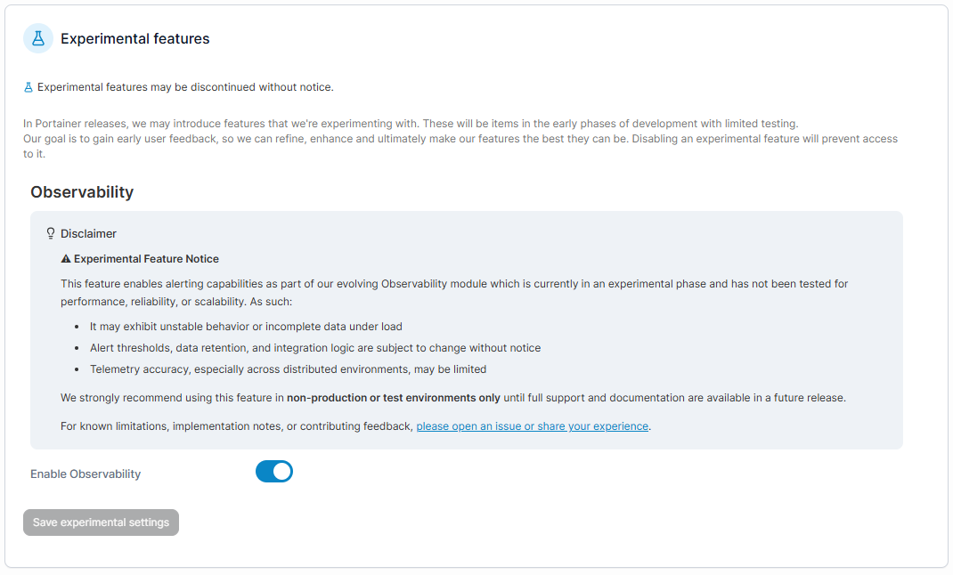 This section allows you to enable experimental Portainer features for use in your deployment. These features are in early development and have gone through a limited set of testing, and are provided to users in order to gather feedback on the feature at an earlier stage of development.