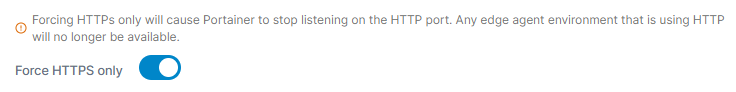 Make sure that your HTTPS configuration is working correctly **before** enabling this option. Failure to do so may result in you being [locked out of your Portainer installation](https://portal.portainer.io/knowledge/i-enabled-force-https-only-and-now-im-locked-out-of-portainer-how-do-i-get-back-in).