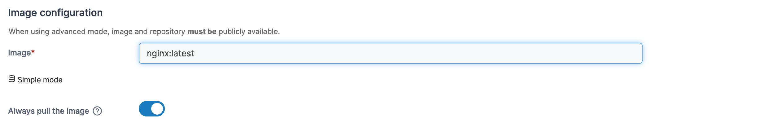 Toggle on to enforce pulling the image from the registry instead of using the locally cached copy (if you have used the image previously).