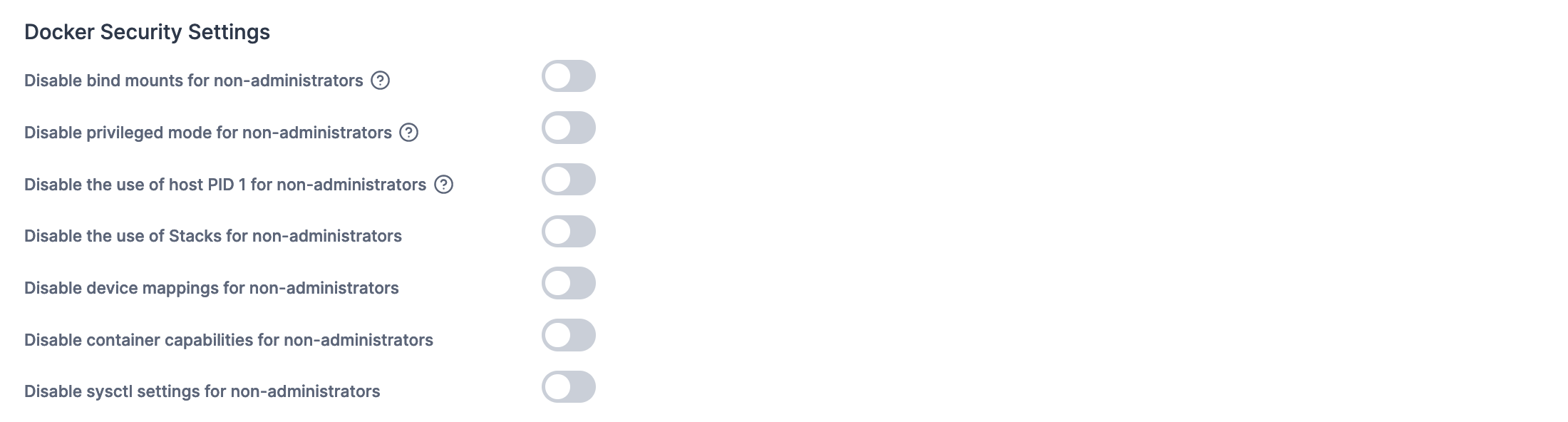 This section allows you to toggle assorted Docker-related security settings for the environment.