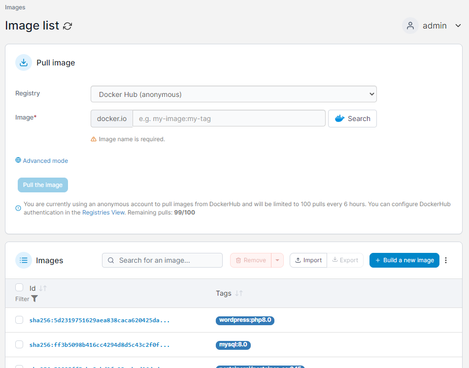 Images are what is used to build containers. Each image defines the pieces required to build and configure a container and can be reused many times. The Images section in Portainer lets you interact with the images in an environment.