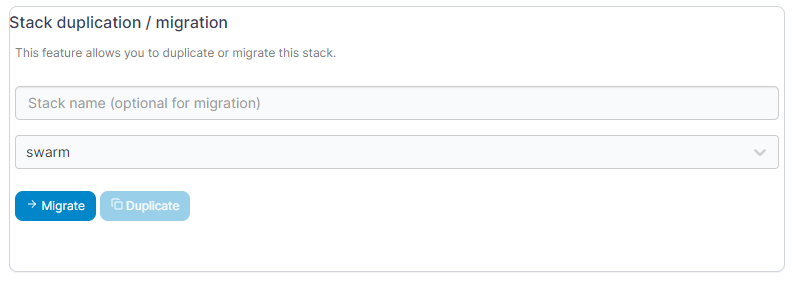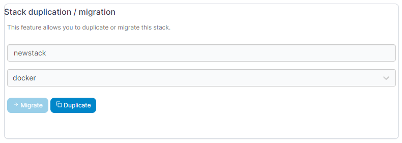 In the Stack duplication / migration section, select the destination environment for the stack, and optionally define a new name for the stack. Click Migrate.