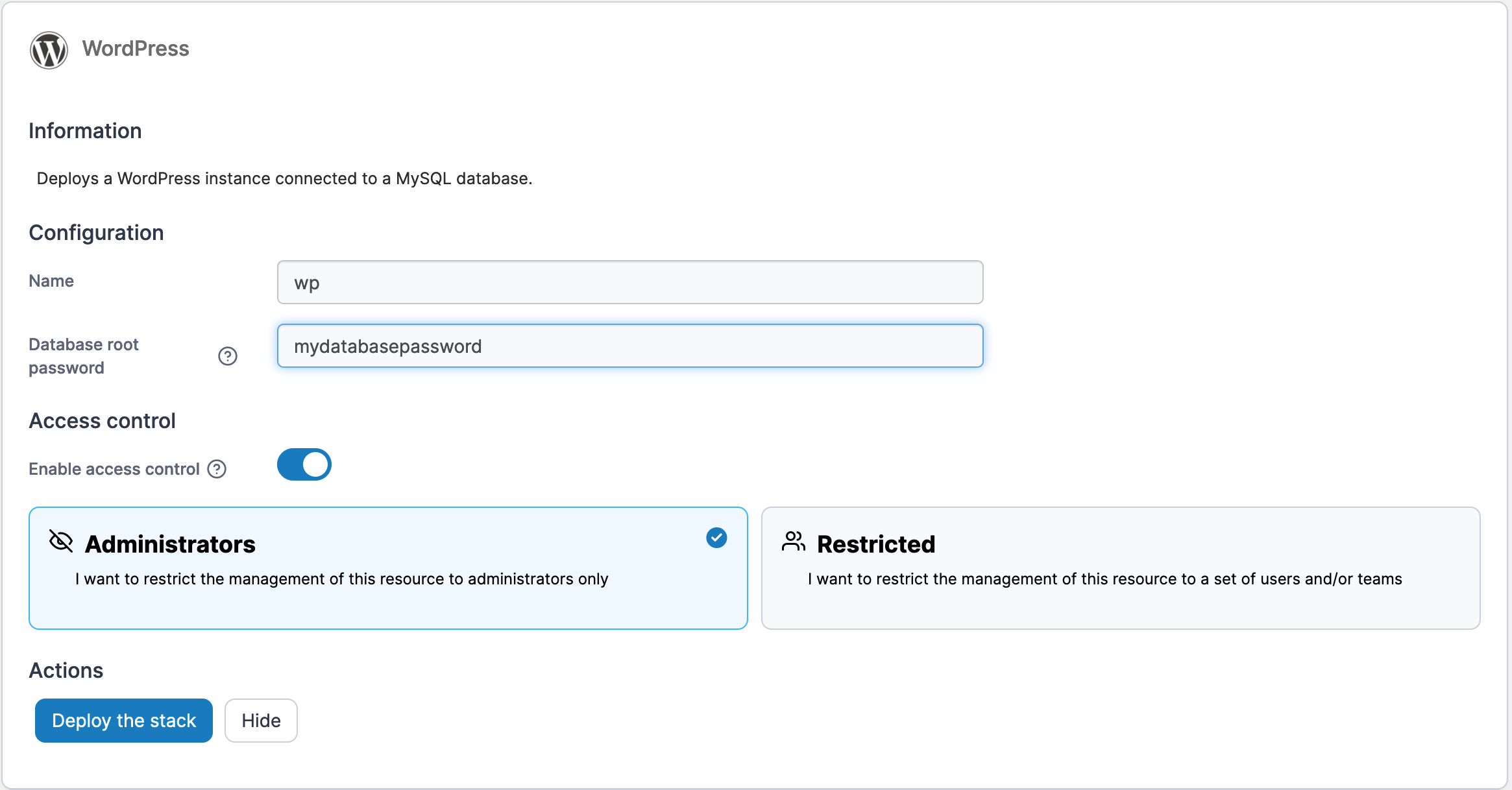 Enter a name for the stack and set any required configuration values (these will differ from template to template). Toggle **Enable access control** on or off as required.