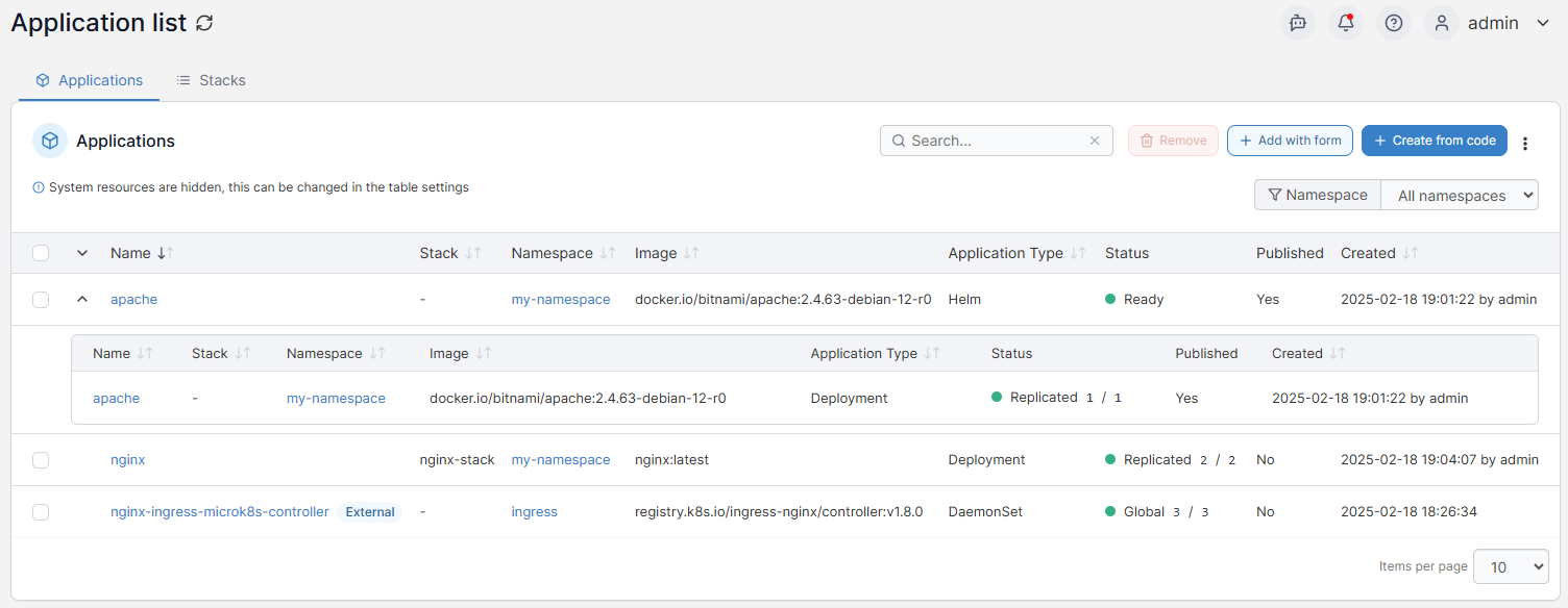You can filter the list of applications by namespace using the Namespace dropdown.