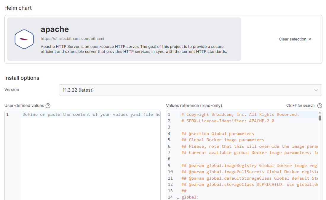 Once you have selected a chart, Portainer will import the values.yaml file for the latest version of the chart and display it in the right hand pane as a reference. You can make any necessary customizations to the values.yaml file in the left-hand pane. You can also choose to deploy a different version of the chart by choosing the version from the Version dropdown.