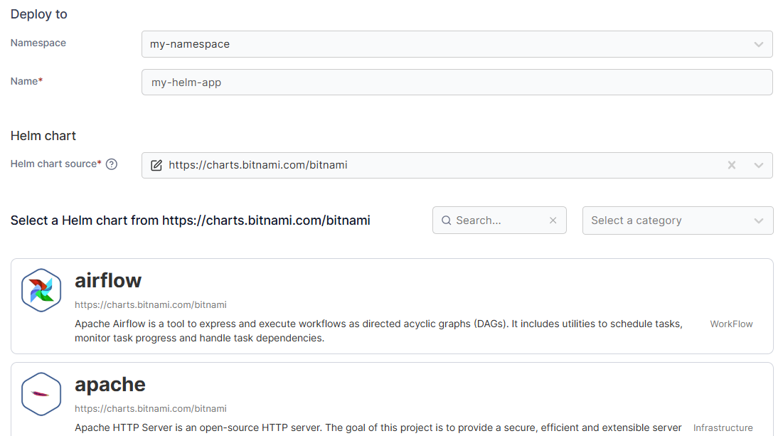 When a Helm chart source is chosen for the first time, it may take some time to download and populate the charts in the list.