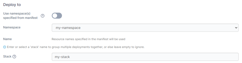If you want to use namespaces defined in your manifest, you can leave Namespace set to default and toggle on the Use namespace(s) specified from manifest option. This option is not available for deployments from Helm charts.