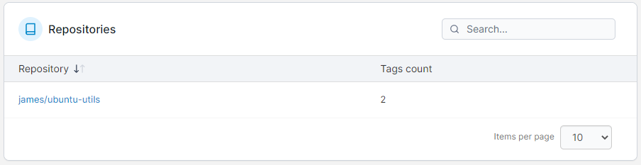 A list of the repositories within a registry, along with the number of tags for each repository appears. Select a repository to view its details.