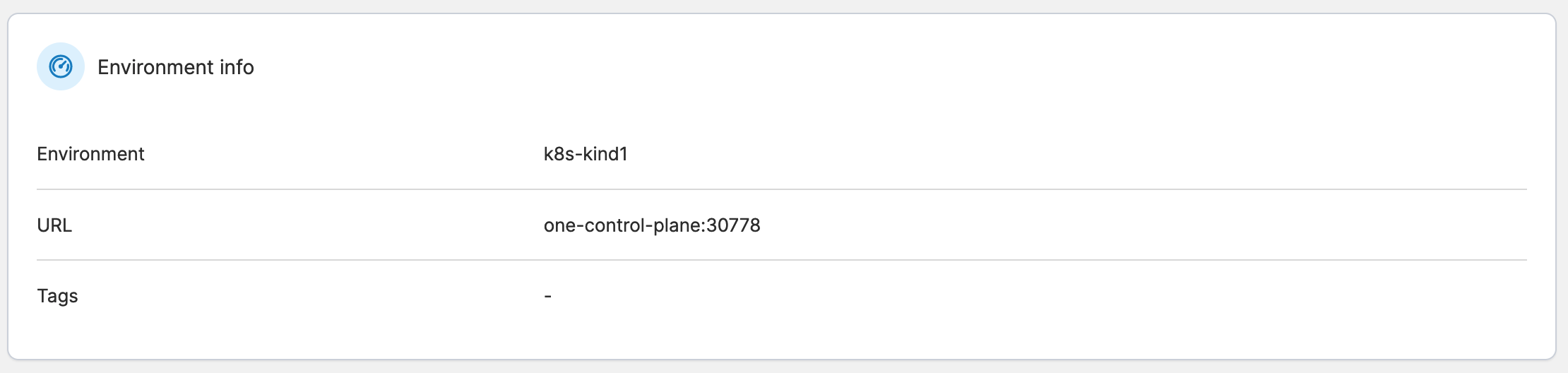 This section shows the environment name, its URL and port, along with any tags.