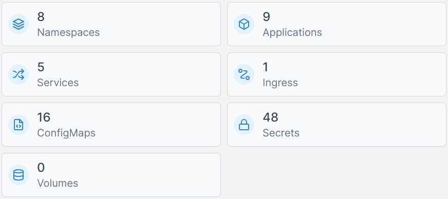 The remaining dashboard is made up of tiles showing the number of [namespaces](https://docs.portainer.io/2.33-lts/user/kubernetes/namespaces), [applications](https://docs.portainer.io/2.33-lts/user/kubernetes/applications), [services](https://docs.portainer.io/2.33-lts/user/kubernetes/networking/services), [ingresses](https://docs.portainer.io/2.33-lts/user/kubernetes/networking/ingresses), ConfigMaps, secrets, and [volumes](https://docs.portainer.io/2.33-lts/user/kubernetes/volumes) that make up the environment.