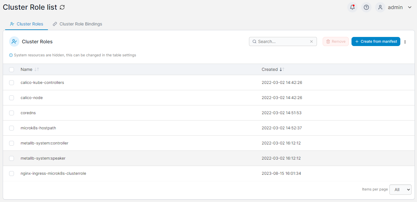 This section lists the Cluster Roles and Cluster Role Bindings on your Kubernetes cluster. New Cluster Roles and Cluster Role Bindings can be created via the Create from manifest button.