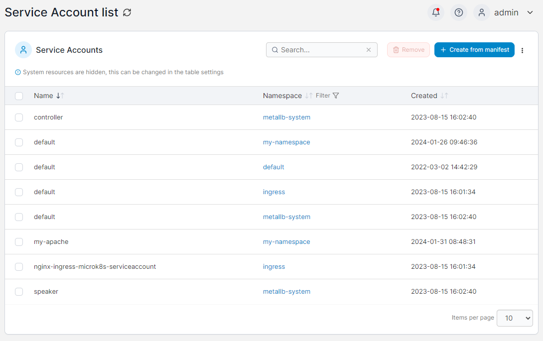 This section lists the Service Accounts on your Kubernetes cluster. The list can be filtered by namespace. You can create new Service Accounts via manifests by clicking **Create from Manifest**, and you can remove Service Accounts by checking the box next to the Service Account to remove and clicking **Remove**.