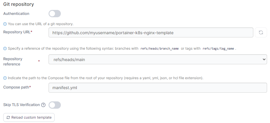 If your template is deployed from a Git repository, you will have the option to edit the Git settings if required. You can also click Reload custom template to update the template from the remote repository.