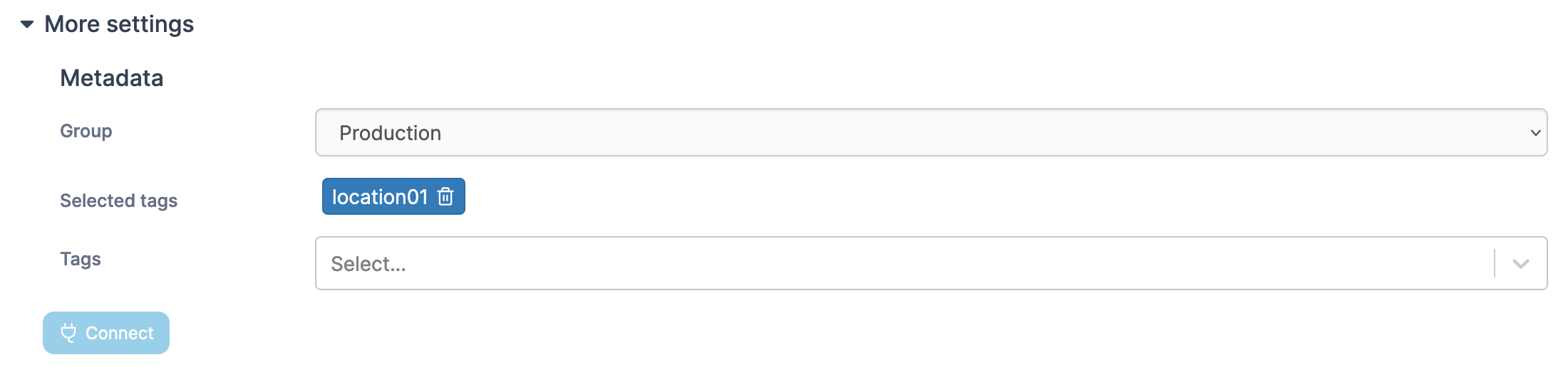 As an optional step you can expand the More settings section and categorize the environment by adding it to a group or tagging it for better searchability.