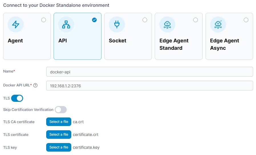 Toggle this option on to skip the verification of the TLS certificate used by the Docker API. If this option is off, the below fields will not appear.