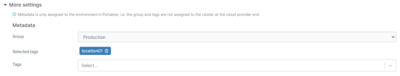 You can also expand the More settings section and set groups and tags for your environment now or you can do this later.