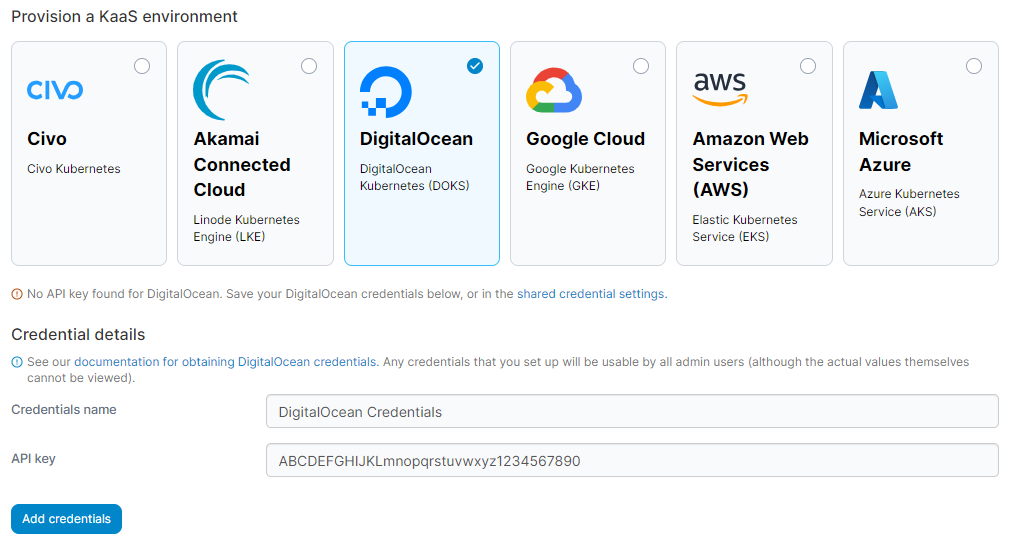 Select the DigitalOcean option from the list of providers. If you haven't already provided your DigitalOcean API token you'll be asked to provide credentials. Provide a name for your credentials and paste your DigitalOcean API token into the API key field and click Add credentials.