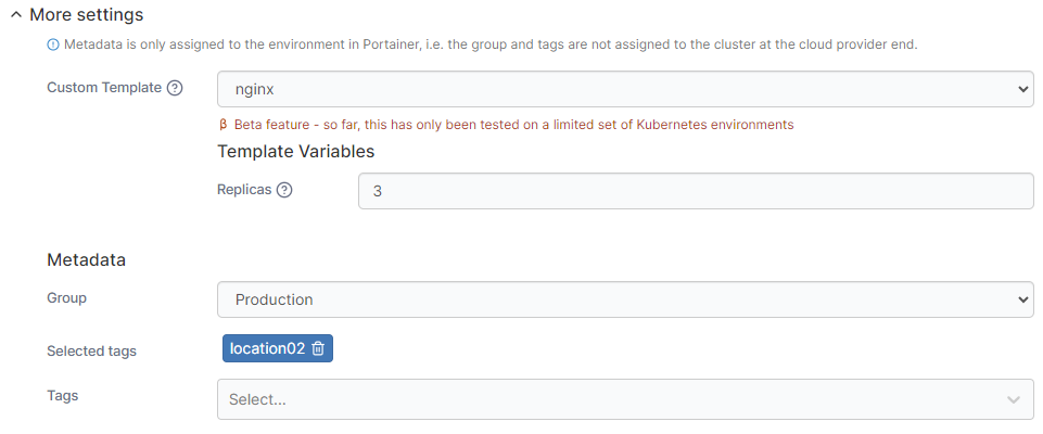 Select a custom template to deploy on your cluster once the MicroK8s and Portainer Agent installations are complete. This is handy for pre-loading a new environment with your applications. The template will be deployed in the default namespace unless the template specifies a namespace to use. You can also set any variables the template requires.
