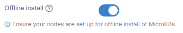 You are now ready to follow the standard procedure in Portainer for creating a MicroK8s cluster, but with the Offline install toggle enabled.