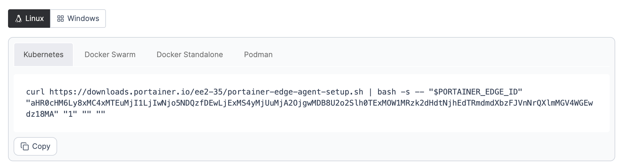 This section allows you to create customized scripts to quickly onboard a number of Edge Agents automatically. Your selections will update the script provided at the bottom of the page which you can then run on your remote environments.