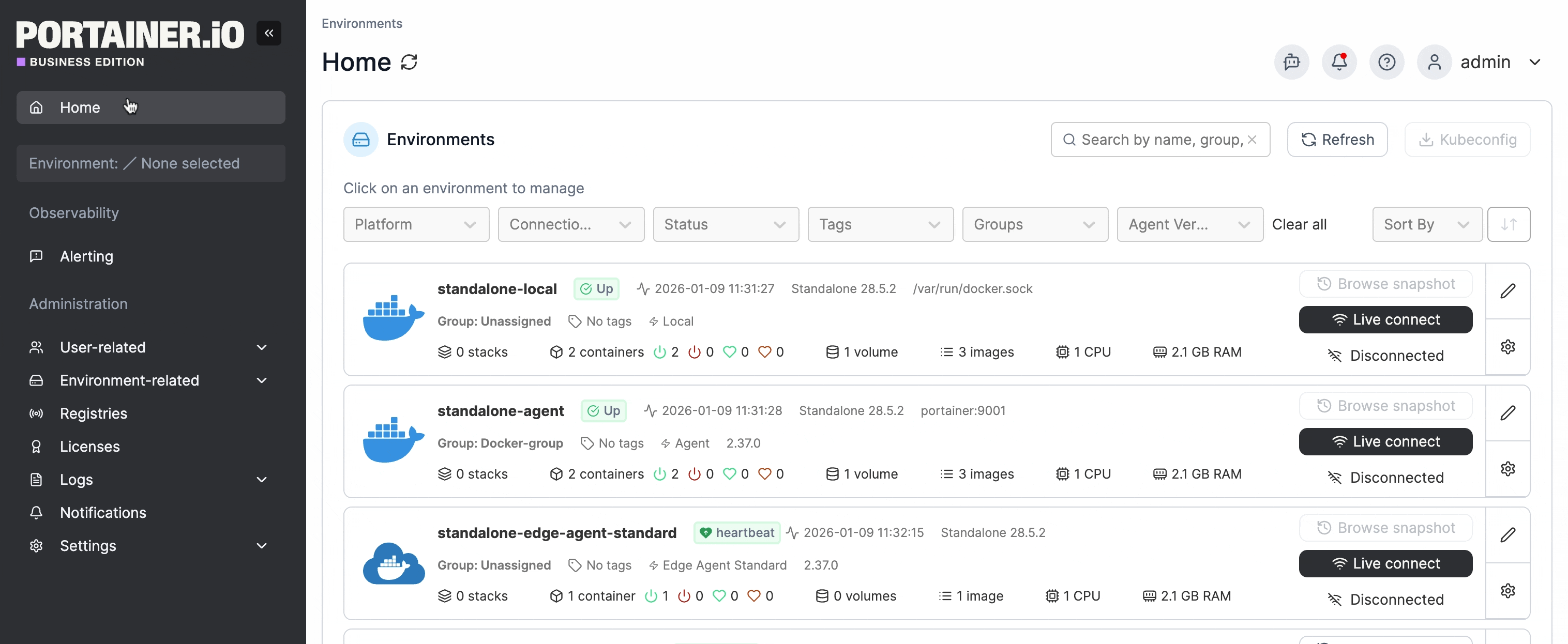 The Environments page lists the environments that can be managed with your Portainer installation. Here you can add new environments either [manually](https://docs.portainer.io/admin/environments/add) or through [auto onboarding](https://docs.portainer.io/admin/environments/aeec), as well as manage which users and groups have access to individual environments.