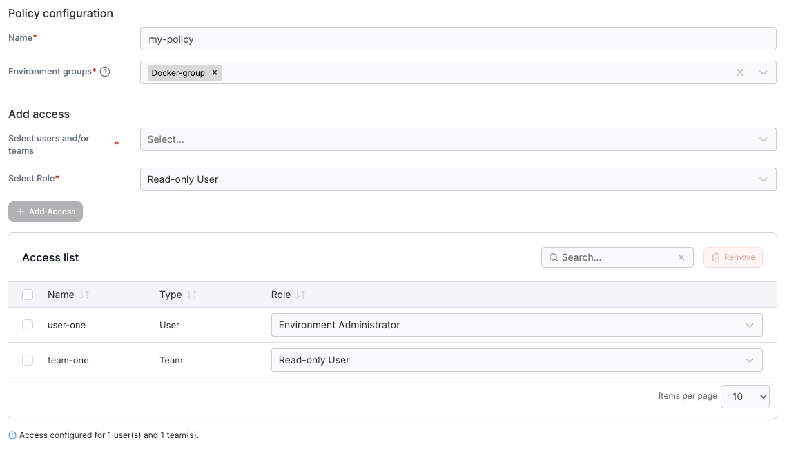 Click Add Access to add the user/team to the policy, multiple users or teams can be added. Each access added will show in the Access list. When you have finished adding access, click Create policy. A confirmation screen displays the changes being made and any existing policy that will be replaced. Click Confirm to acknowledge the changes and create the policy.