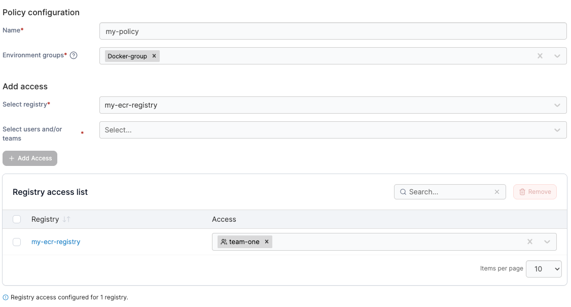 Click Add Access to add the registry to the access list, multiple entries can be added. Each access added will show in the Registry access list. When you have finished adding access, click Create policy. A confirmation screen displays the changes being made and any existing policy that will be replaced. Click Confirm to acknowledge the changes and create the policy.