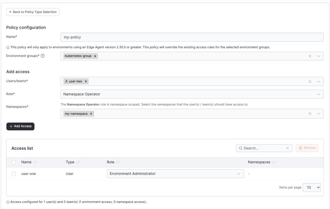 Click Add Access to add a user or team to the policy. You can add multiple users or teams, and each entry appears in the Access list. When you have finished adding access, click Create policy. A confirmation screen displays the changes being made and any existing policy that will be replaced. Click Confirm to acknowledge the changes and create the policy.