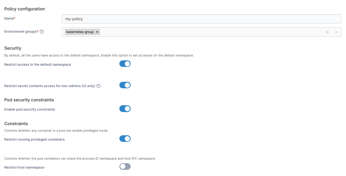 Pod security constraints can be used to define under what conditions workloads can run. To set these constraints, toggle this option on, then toggle and configure the features you require. More information on each pod security constraint option can be found in the Kubernetes security constraints documentation.