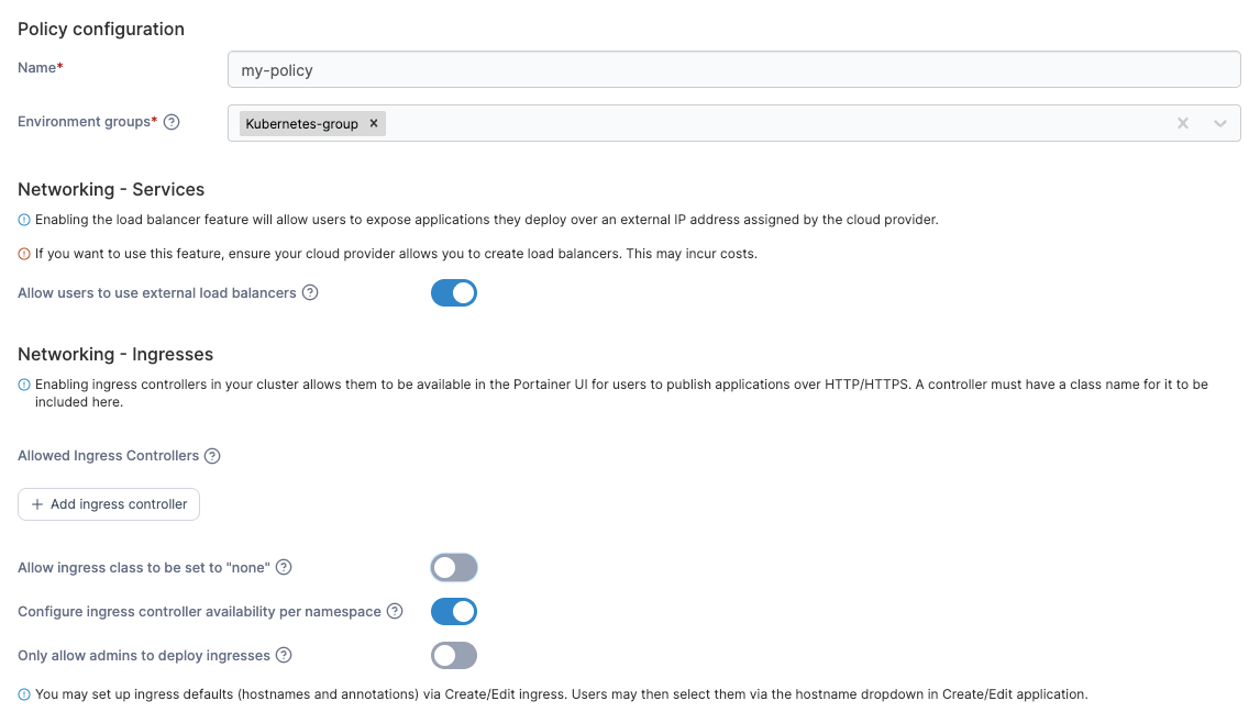 Select one or more Kubernetes environment groups from the dropdown menu. If the selected group is already included in an existing policy, a warning icon will appear next to the group name.