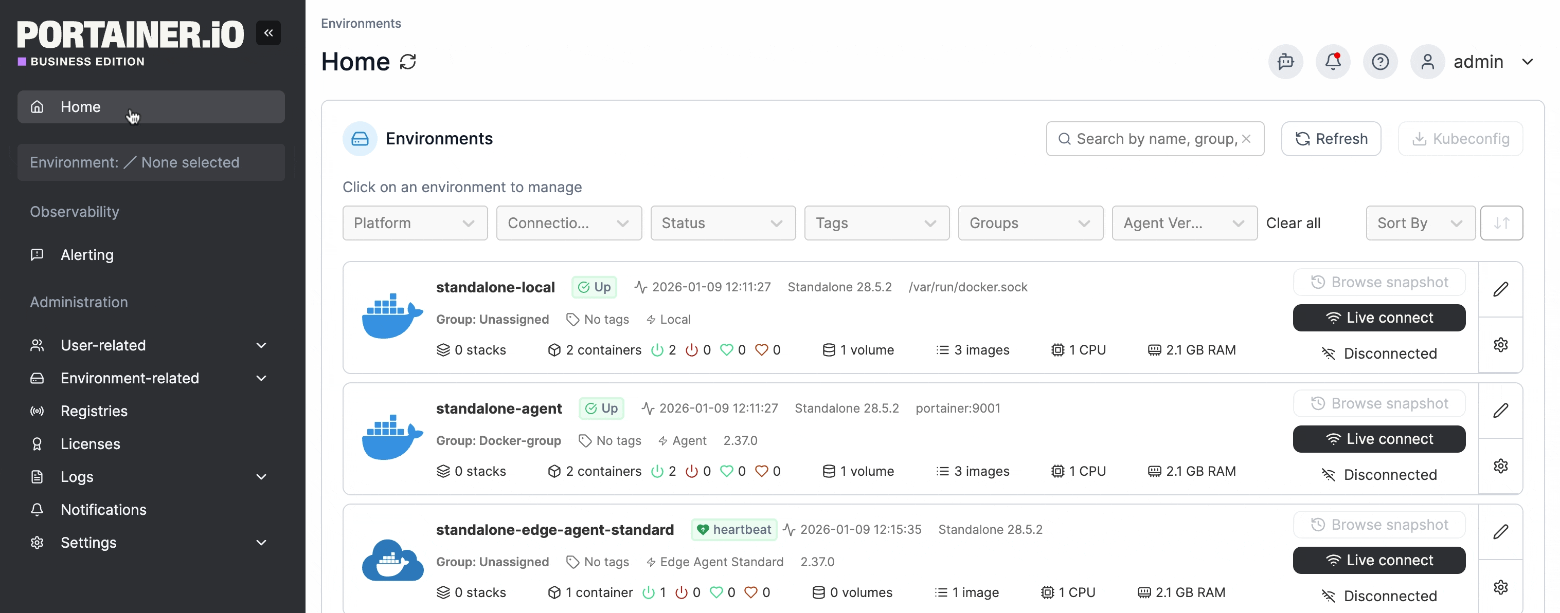 Environment tags will be visible on the Portainer home page. You can also search for environments based on their tags.