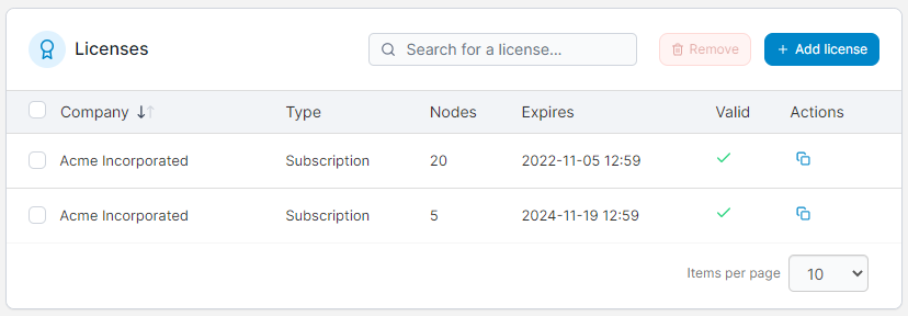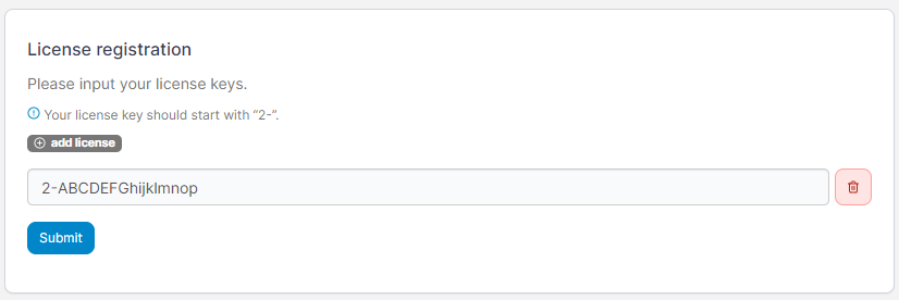 If you want to add more nodes to your environment than your license allows, first upgrade your license then click Add license, enter your license key then click Submit.